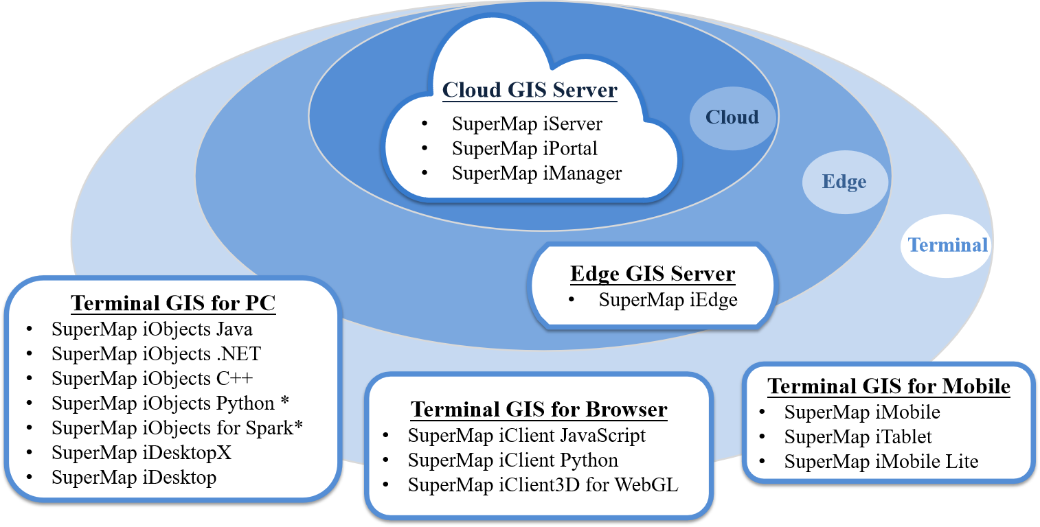 SuperMap GIS 产品系列中的云GIS平台软件包括 SuperMap iServer、SuperMap iPortal、SuperMap iManager。
