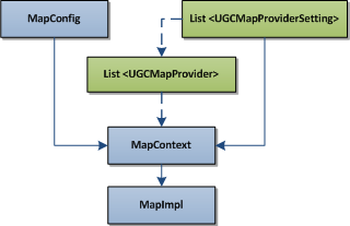 上图为使用 SuperMap 数据构建一个 Map 组件的过程(MapImpl),其中箭头表示初始化的流程,虚线箭头表示在 MapContext 中,另一种设置服务提供者的方式,本文示例的流程跟实线箭头表示的流程一致。即通过地图配置(MapConfig)和 SuperMap 地图服务提供者配置(UGCMapProviderSetting)直接构建地图组件上下文(MapContext),然后由地图组件上下文初始化地图组件(MapImpl 对象),示例代码如下(China400.smwu 工作空间的全路径要根据实际情况修改):