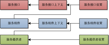 从对应关系上来讲,一个服务接口对应一个或多个服务组件,一个服务组件对应一个或多个服务提供者。注意,有的服务接口例如 WMS 服务接口,就只能对应一个地图服务组件。