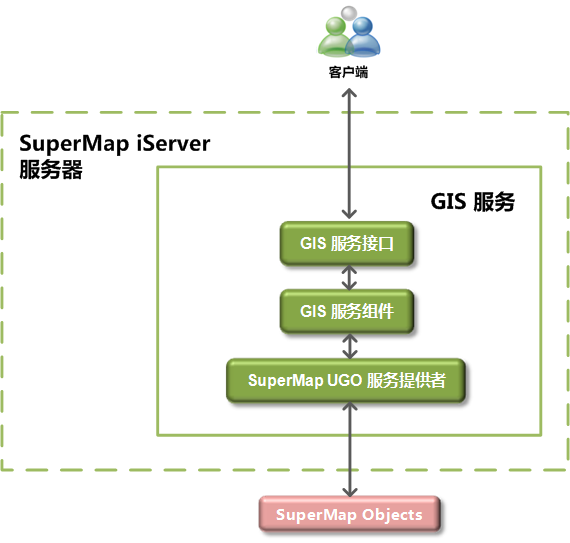 SuperMap iServer 的实现分三层:服务提供者、服务组件和服务接口。服务组件使用服务提供者提供的 GIS 服务,服务组件的 GIS 功能可以以指定的服务接口形式发布出来。这种层级结构有利于对 GIS 功能进行封装,实现聚合、实现集群,并方便将 GIS 功能发布为各种服务。