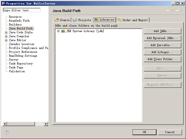 在弹出的 Properties for HelloiServer 窗口左侧选择 Java Build Path,然后在右侧选择 Libraries 选项卡,单击 Add External JARs 按钮,如下图所示。