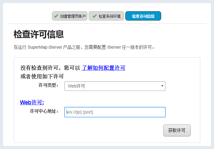 2.本机没有许可时,在“检查许可信息”步骤中将显示云许可、教育许可和 Web 许可三个可选项,选择 Web 许可,在 Web 许可中心地址中填入您期望连接的 Web 许可中心的地址,如:'ws://192.168.17.212:9183',点击获取许可,即显示从许可中心检测到的可用的许可。