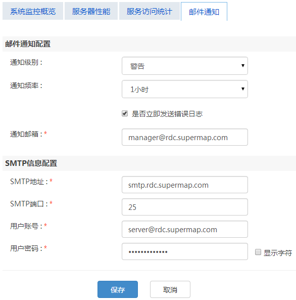 访问 SuperMap iServer 服务管理器 WebManager,依次点击“监控与统计”、“邮件通知”选项卡, 进入邮件通知设置页面(http://localhost:8090/iserver/manager/serverstatus/emailnotifier)。您可以根据日志信息的级别设置通知的频率等信息: