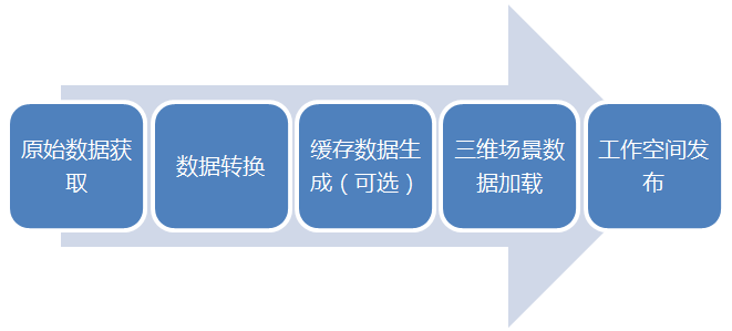 但是,很多情况下,用户手中的数据来自各个方面,包括不同的种类,在使用三维场景加载数据前需进行数据转换处理并生成相应的三维缓存数据。SuperMap 三维服务发布的总体流程为: