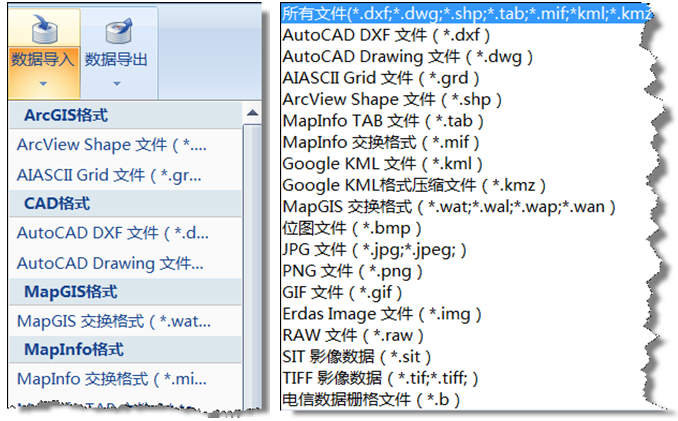 如三维场景中的数据所述,SuperMap 三维服务支持发布的数据类型包括矢量数据、地图、影像、地形、模型、KML 数据,其中既有二维的原始数据又有对应的三维缓存数据。而用户手中的来自各方的原始数据不一定都是 SuperMap 的数据格式,不过目前 SuperMap 的数据转换模块已提供了20种常用数据格式的导入功能,分别显示在“数据导入”下拉按钮的下拉菜单中,并且对这些数据格式进行分组,对应的可导入的文件类型如下图所示。