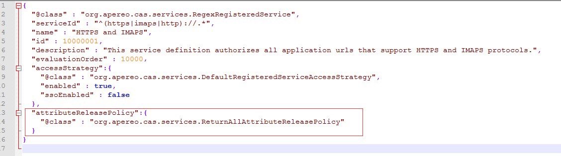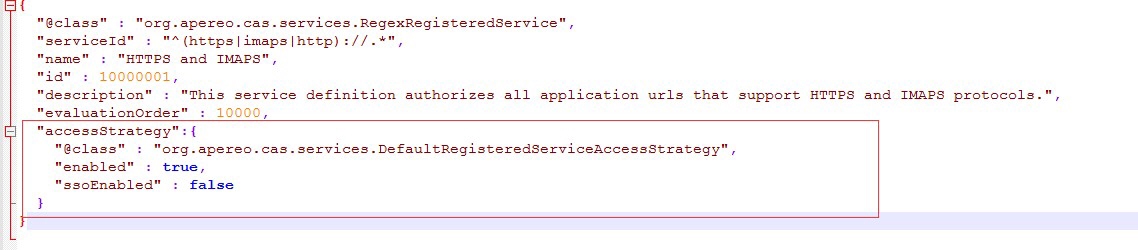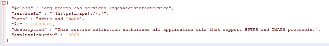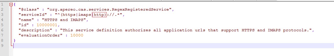 首先打开 cas \WEB-INF\classes\services 目录下的 HTTPSandIMAPS-10000001.json 文件,如下: