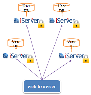 如果不使用单点登录,则用户访问不同的 GIS 服务器时,都需要登录才能访问。每一个 GIS 服务器都有自己的用户数据库,每次进行用户验证时都要各自读取用户数据库的信息。