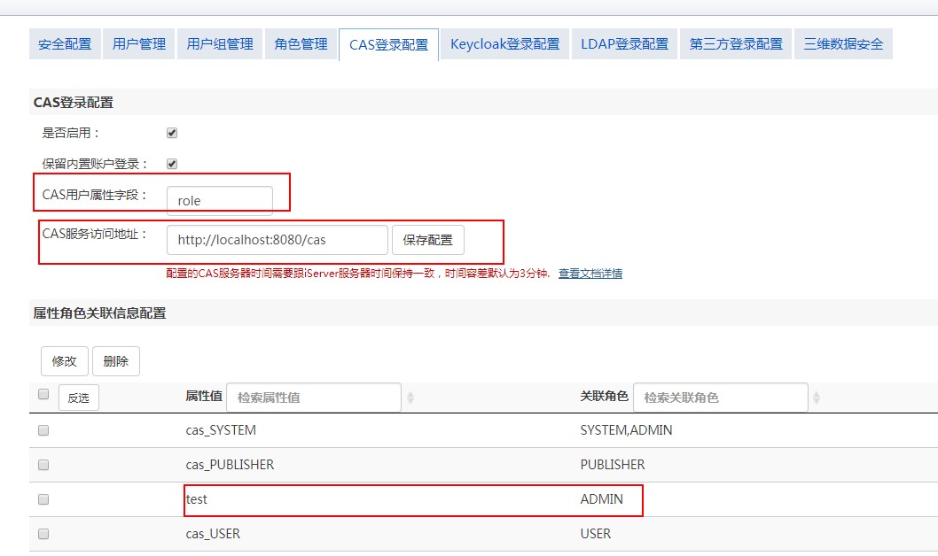 CAS 属性值与 iServer、iPortal、iEdge 的已有角色的关联,二者是多对多关系。例如,iServer 的内置角色 USER、PUBLISHER、ADMIN 分别默认匹配 cas_USER、cas_Publisher、cas_ADMIN 三个 CAS 用户属性,如果 CAS 服务器指定关联字段中没有这三个属性值,则该关联不生效。