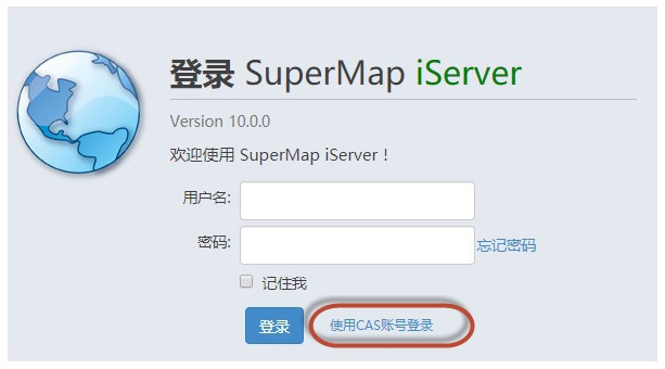 启用了单点登录以后,就可以使用 CAS 用户访问受保护的服务或登录服务管理器了。如果配置单点登录时勾选了“保留内置账户登录”,则访问受保护的服务或服务管理器时,登录界面如下图所示。可以选择使用 iServer 原有的用户直接登录,或者点击“使用 CAS 账号登录”后,跳转到 CAS 用户的登录界面,CAS 用户即可登录。CAS 服务器验证成功后,用户就可以访问 iServer 的服务以及关联到该 CAS 服务器的所有 iServer、iEdge 以及 iPortal 的 GIS 服务。