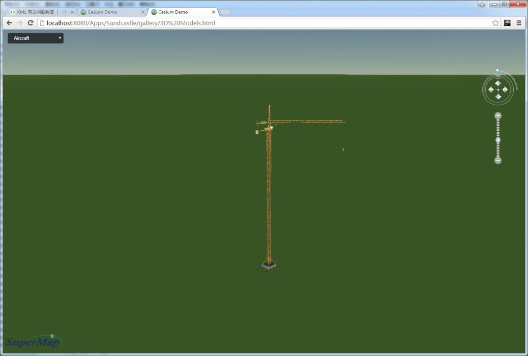 (3)以localhost方式打开“KML_crane.html “网页,浏览器输入地址即为: http://localhost:8090/%WebGL产品包%/examples/ KML_crane.htm