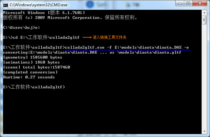 (3) 输入命令行,命令格式为: collada2gltf.exe –f %daePath% -e