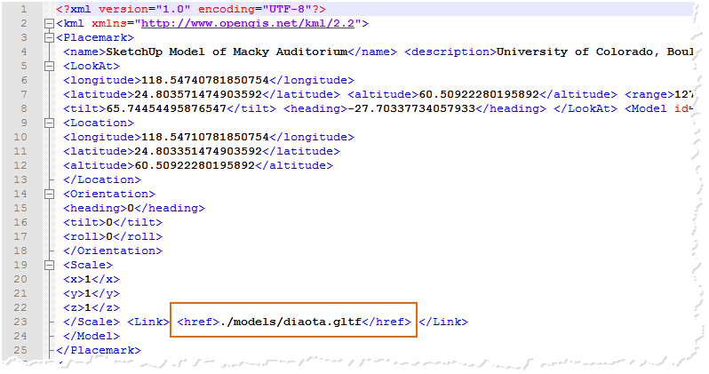 (2) 进入WebGL产品包存放路径(%SuperMap iServer_HOME%/webapps),在“examples/SampleData”文件夹下,文本方式打开“crane.kml“文件,修改KML文件中模型的存放地址,如下图的内容。