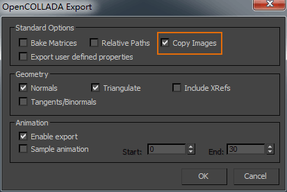 (3).点击“保存”,弹出“OpenCOLLADA Export”对话框,勾选”copy Images”,点击OK。